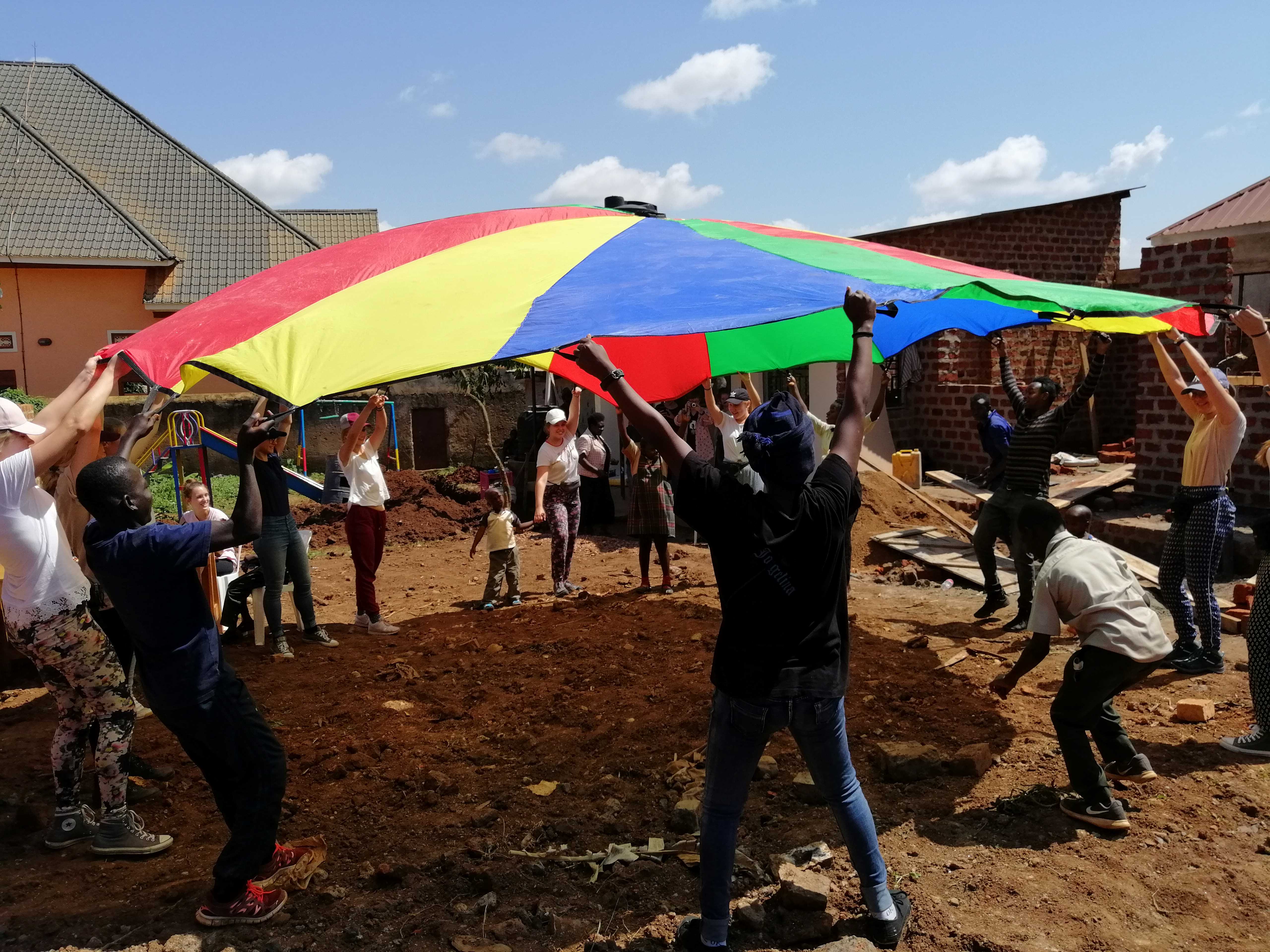 Andere spielten mit den Kindern. Besonders viel Spaß hatten die Kinder bei dem Spiel mit dem Schwungtuch, welches wir ihnen beibrachten.