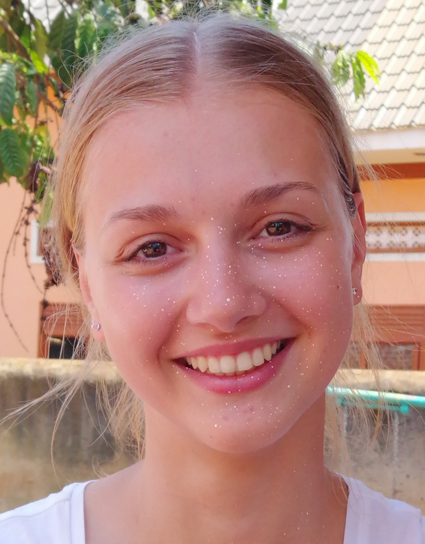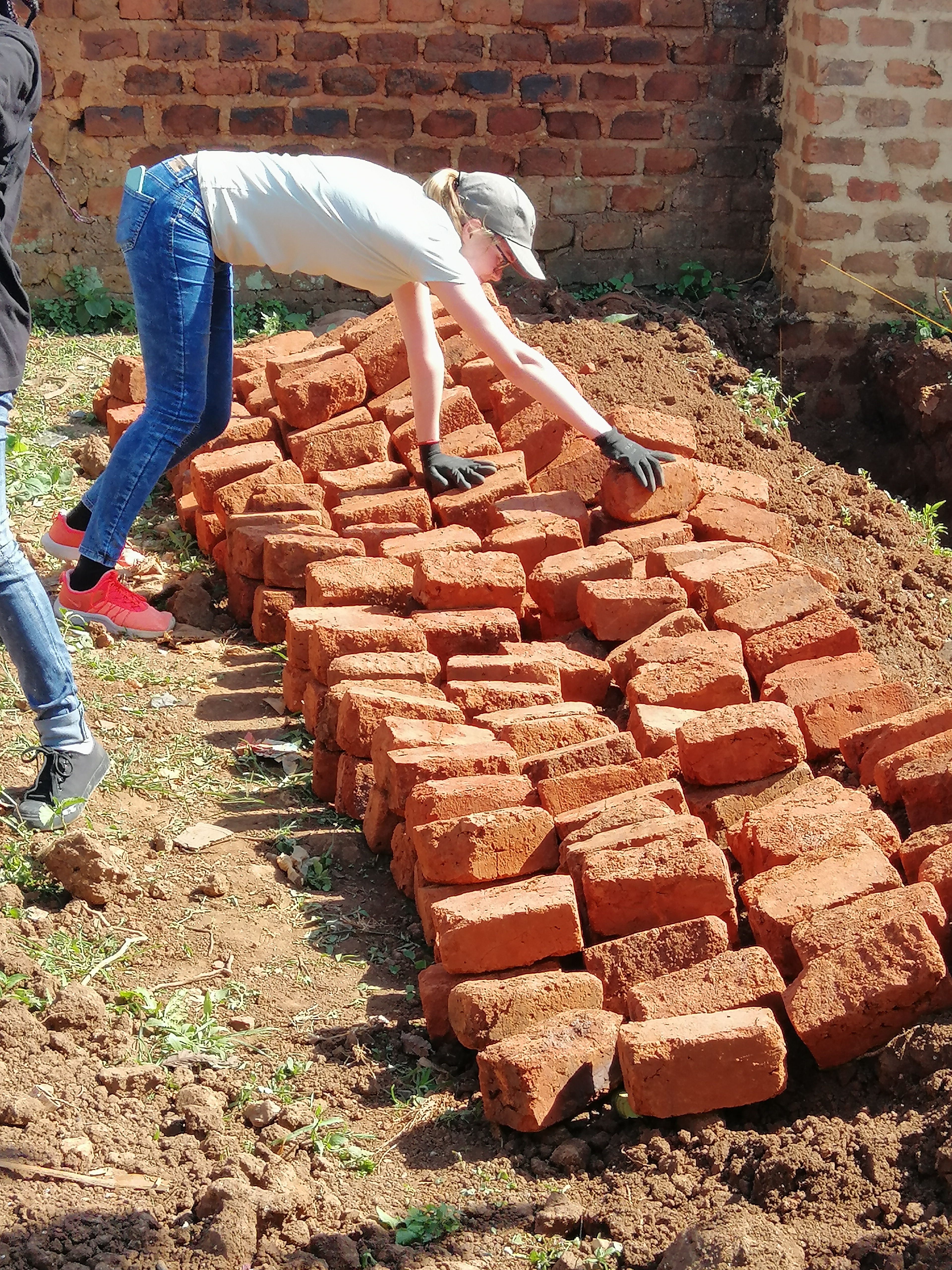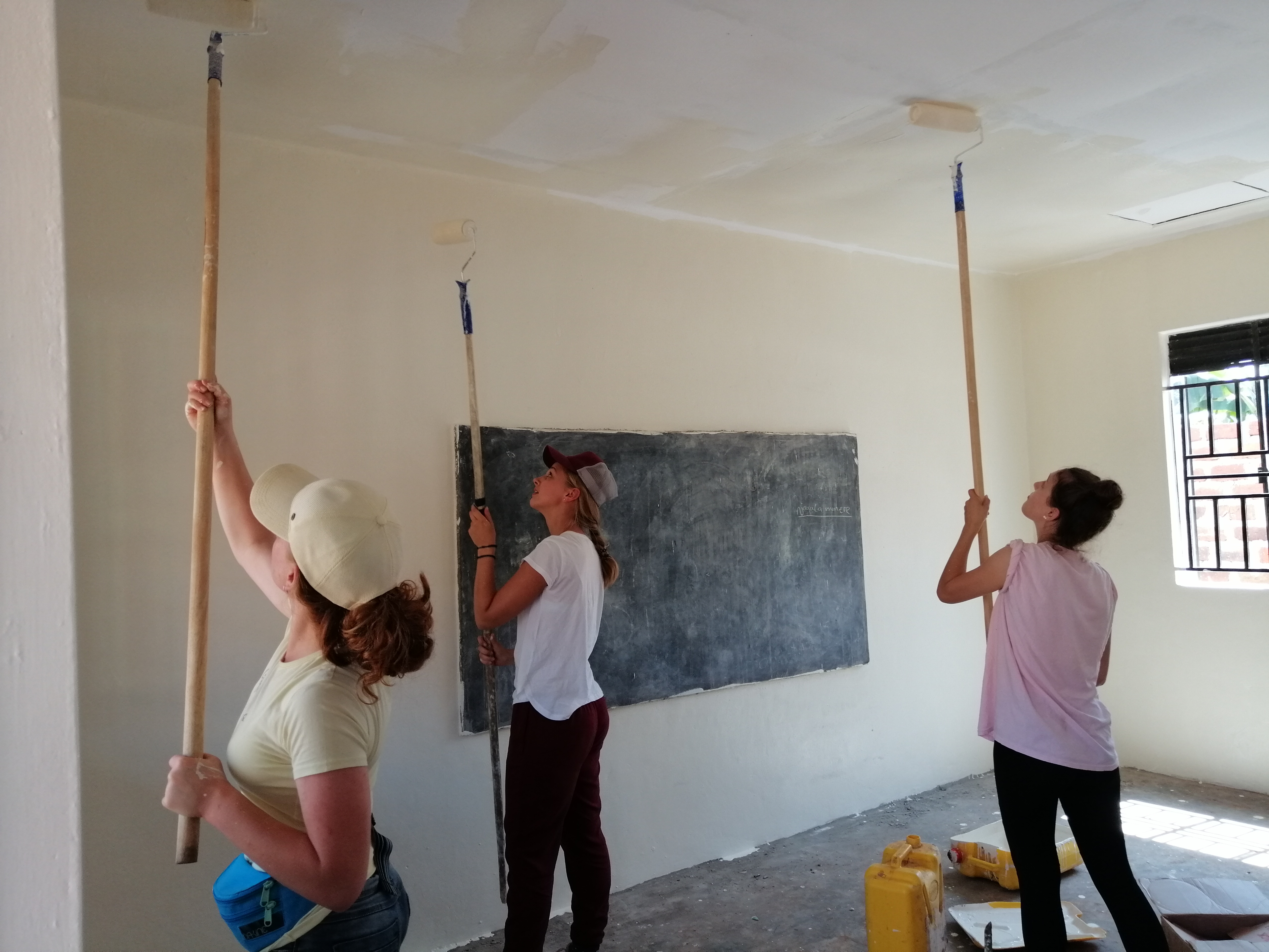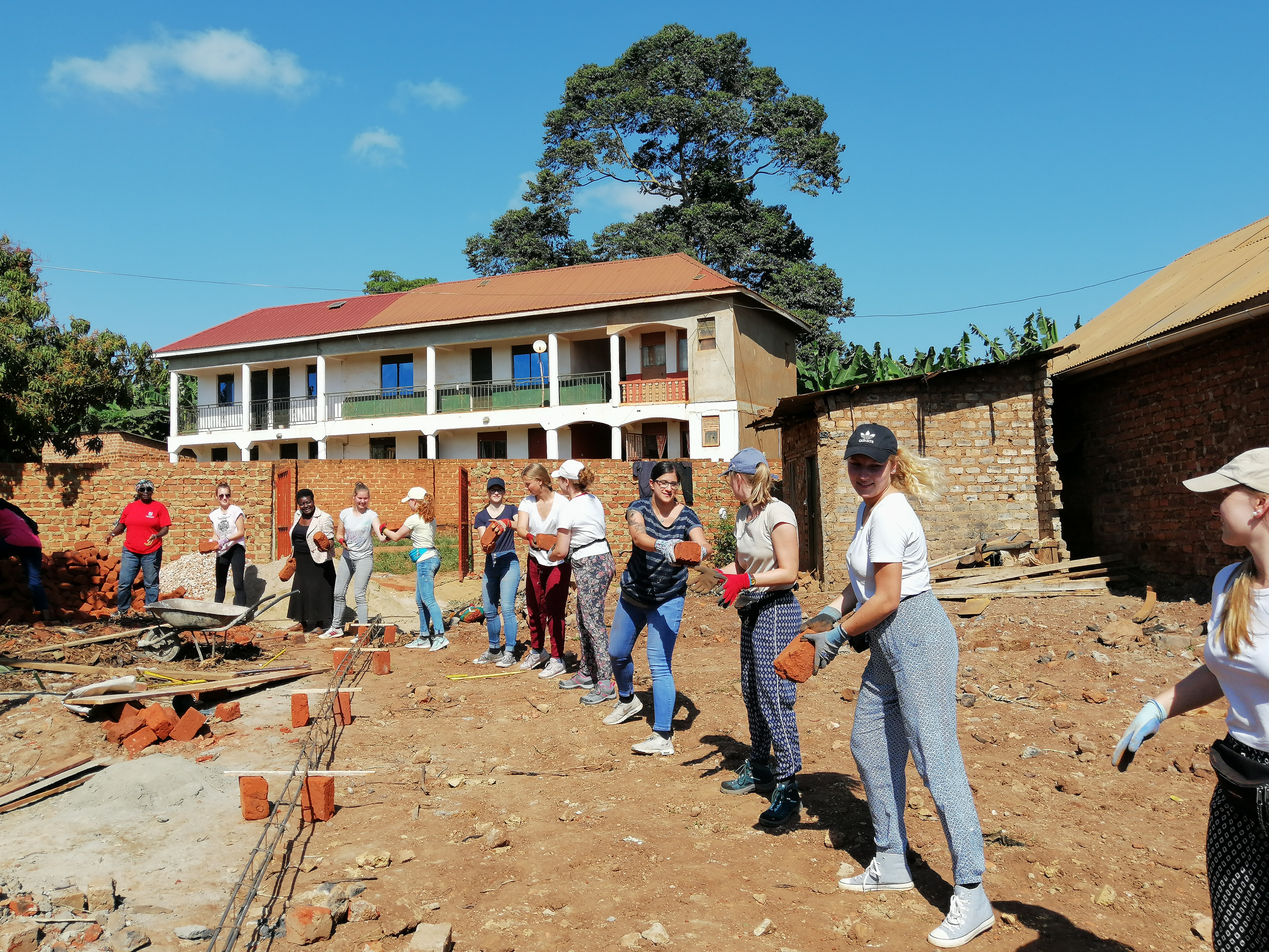 Unsere Mittagspause machten wir in unserer Unterkunft. Nachdem wir uns ordentlich gestärkt hatten, fuhren wir wieder zur Schule. Die Kinder waren mittlerweile zu Hause und wir konnten weiterarbeiten. Wir haben die Decke zuende gestrichen und Steine dorthin befördert, wo sie bald gebraucht werden, um eine Abgrenzung für den Spielplatz zu mauern. Durch unsere Menschenkette haben wir die Ziegelsteine schnell von einem Ende des Hofes zum anderen Ende transportiert.