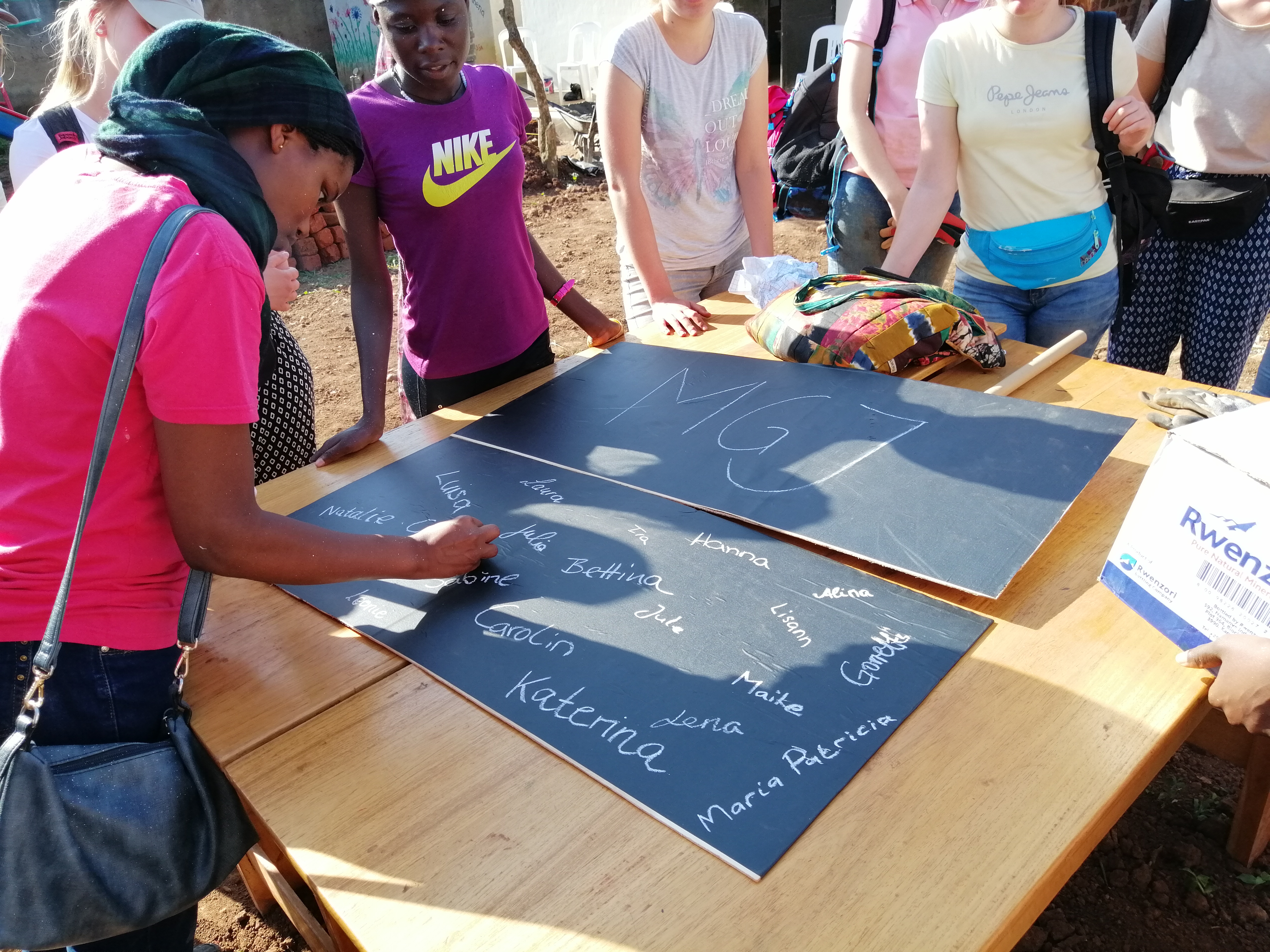 unser erster Arbeitstag begann heute mit einem Anti-Langschläfer-Frühstück. Gegen halb zehn ging es für uns mit dem Bus los zur Schule in Garuga. Im Gepäck hatten wir Zeichenblöcke, Malkästen und Kinderschuhe. Als wir dort ankamen, wurden wir herzlich empfangen. Unsere zum Teil gebrauchten und ausrangieren Schuhe wurden hier mit Begeisterung aufgenommen und als „gutes“ Paar Schuhe, z.B. für die Sonntagsmesse, eingeplant.