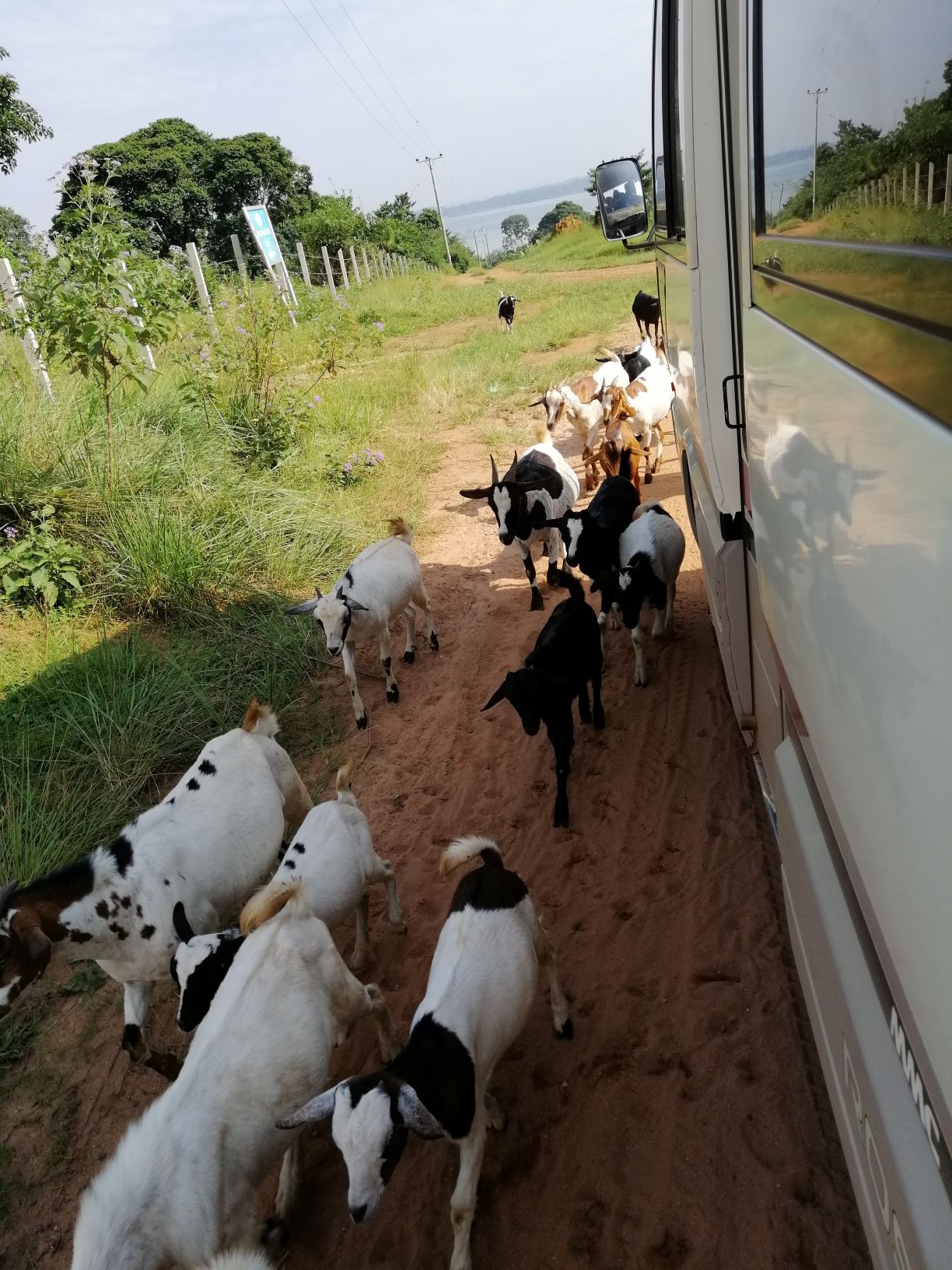Nach unserem gemeinsamen Frühstück ging unsere Reise heute zum Markt nach Kampala. Die Busfahrt war zu Beginn gewohnt holprig, stellenweise hatten wir Begleitschutz.