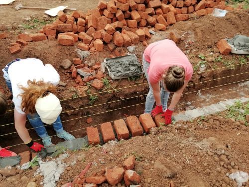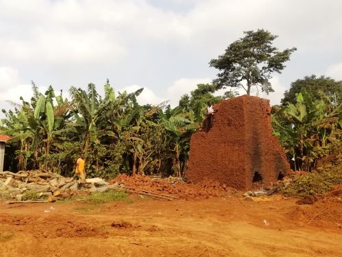 An unserem dritten Arbeitstag haben wir uns besonders auf das Mauern konzentriert und haben bereits große Fortschritte gemacht. Ein Haufen Ziegelsteine lag ja bereits bei unserer Ankunft letzte Woche im Innenhof und wartete auf uns. Auf unserem täglichen Weg zur Schule gibt es entlang der Straße unzählige Ziegelhersteller. Hier wird für jeden einzelnen Ziegel Lehm in eine Form gepresst. Die Ziegel werden anschließend in einem Ofen gebrannt oder trocknen in der Sonne.