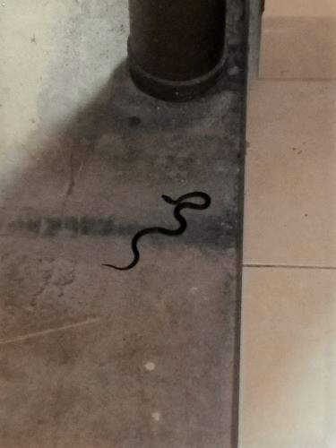 Wir wollten zwar nicht als unhöfliche Gastgeber gelten, entschieden uns aber dennoch dafür, die Schlange hinaus zu befördern. Die ersten Versuche das Tierchen in einen Papierkorb oder Karton zu befördern waren leider nicht erfolgreich – und die Schlange auch eher not amused. Mit Besen und Kehrblech gelang uns aber schließlich den ungebetenen Gast vor die Tür zu setzen…
