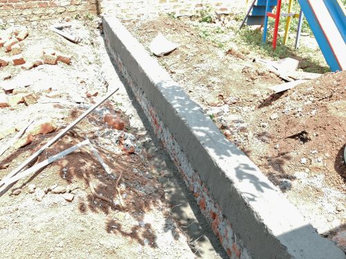 Anders als erwartet ist die Mauer schon fertig, da sie nur ca. einen halben Meter hochgezogen wurde. Sie dient nur als kleine Abgrenzung zum Sandkasten, der in dem abgetrennten Bereich entstehen soll. Die Mauer wurde schon zum Teil verputzt – das wollten uns die Handwerker dann doch nicht überlassen.
