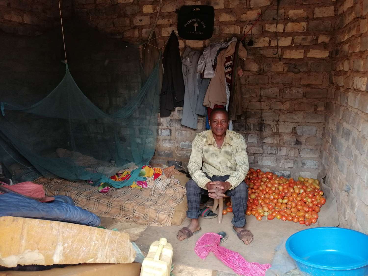 Eine an der Mauer befestigte Kordel dient als Kleiderschrank. Eine alte Schaumstoffunterlage auf dem Boden ist sein Bett, darüber ist notdürftig ein Netz befestigt, um sich vor den Moskitos zu schützen. Wegen der Tomaten, die er in der Hütte lagert, gibt es besonders viele Tiere in der Hütte, erzählt er uns. Sein Fahrrad ist wahrscheinlich sein größter Besitz und gleichzeitig seine Existenzgrundlage.