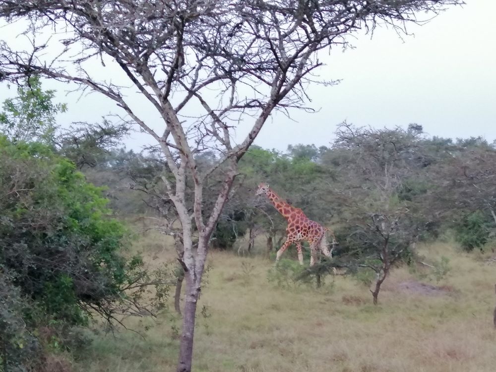 Der Rückweg ging in der Dämmerung wieder durch den Nationalpark. Mit diesmal offenem Dach und Blick auf den Sonnenuntergang bekamen wir Wasserbüffel, Paviane und Giraffen zu sehen. Da freute sich sogar unser Ranger: „Now my job is done.“